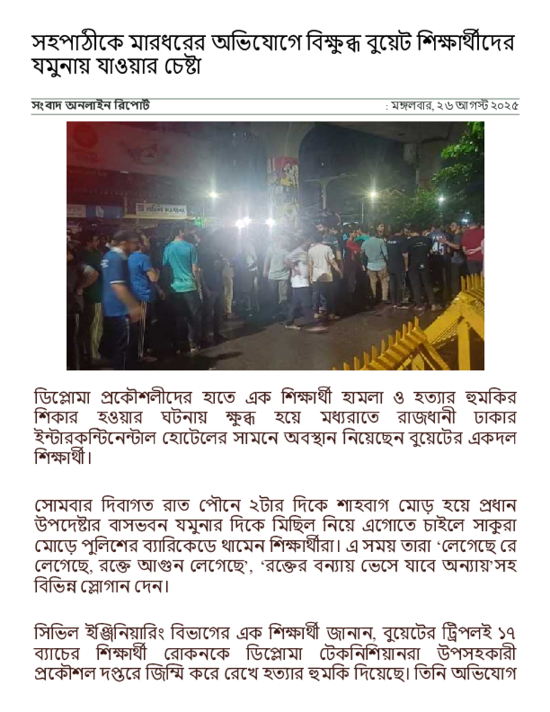 সহপাঠীকে মারধরের অভিযোগে বিক্ষুব্ধ বুয়েট শিক্ষার্থীদের যমুনায় যাওয়ার চেষ্টা _ সংবাদ.pdf