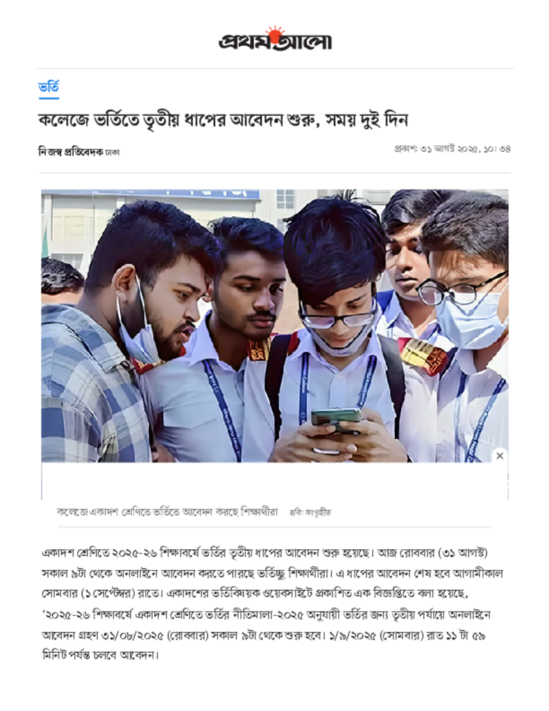 কলেজে ভর্তিতে তৃতীয় ধাপের আবেদন শুরু, সময় দুই দিন.pdf Published on 31 August 2025 Newspaper দৈনিক প্রথম আলো Category Admission / Seat Problem General Education Download