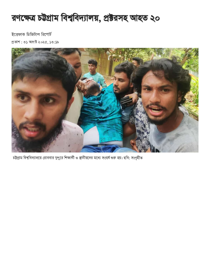 রণক্ষেত্র চট্টগ্রাম বিশ্ববিদ্যালয়, প্রক্টরসহ আহত ২০.pdf Published on 31 August 2025 Newspaper দৈনিক ইত্তেফাক Category Campus Terrorism General Education Download