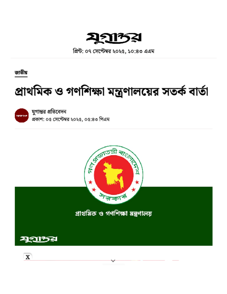প্রাথমিক ও গণশিক্ষা মন্ত্রণালয়ের সতর্ক বার্তা.pdf Published on 05 September 2025 Newspaper দৈনিক যুগান্তর Category Educational Ministry / Departments Education Ministry / Division / Directorate Download