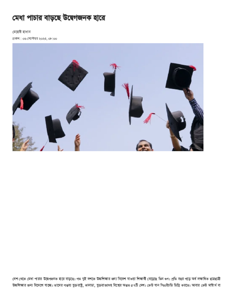 মেধা পাচার বাড়ছে উদ্বেগজনক হারে.pdf Published on 06 September 2025 Newspaper দৈনিক ইত্তেফাক Category Personal Opinion / Discussion / Commentary Download