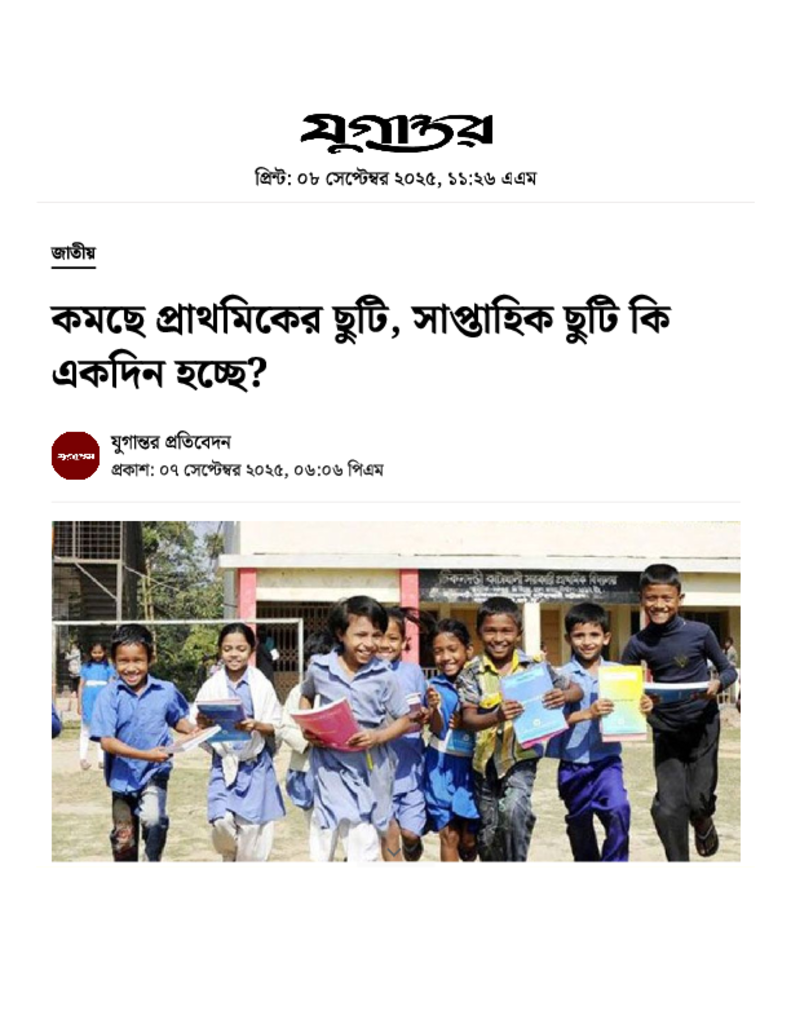 কমছে প্রাথমিকের ছুটি, সাপ্তাহিক ছুটি কি একদিন হচ্ছে_.pdf Published on 07 September 2025 Newspaper দৈনিক যুগান্তর Category Educational Ministry / Departments Education Ministry / Division / Directorate Download