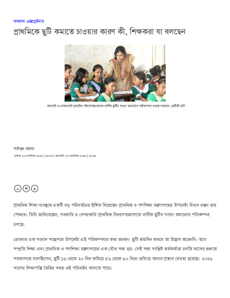 প্রাথমিকে ছুটি কমাতে চাওয়ার কারণ কী, শিক্ষকরা যা বলছেন.pdf Published on 07 September 2025 Newspaper দৈনিক সমকাল Category Personal Opinion / Discussion / Commentary Download