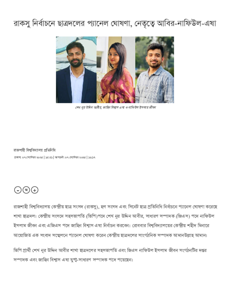 রাকসু নির্বাচনে ছাত্রদলের প্যানেল ঘোষণা, নেতৃত্বে আবির-নাফিউল-এষা.pdf Published on 07 September 2025 Newspaper দৈনিক সমকাল Category Student Politics Download