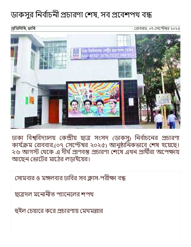 ডাকসুর নির্বাচনী প্রচারণা শেষ, সব প্রবেশপথ বন্ধ _ সংবাদ অনলাইন.pdf Published on 07 September 2025 Newspaper দৈনিক সংবাদ Category Student Politics General Education Download