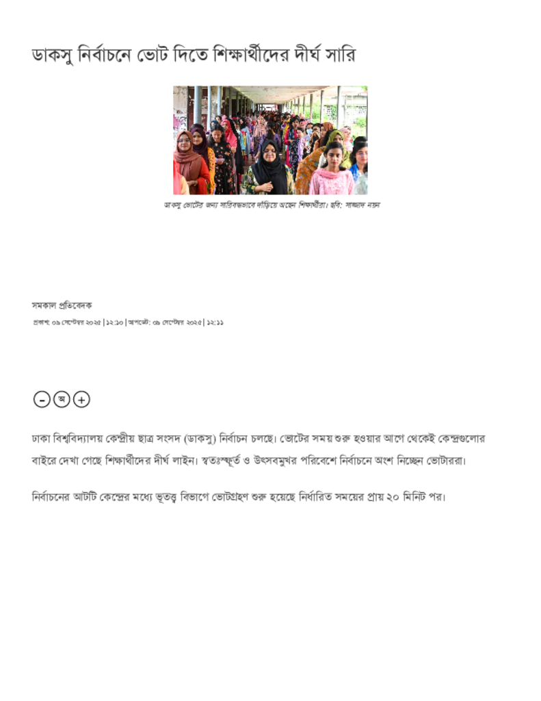 ডাকসু নির্বাচনে ভোট দিতে শিক্ষার্থীদের দীর্ঘ সারি.pdf Published on 09 September 2025 Newspaper দৈনিক সমকাল Category Student Politics General Education Download