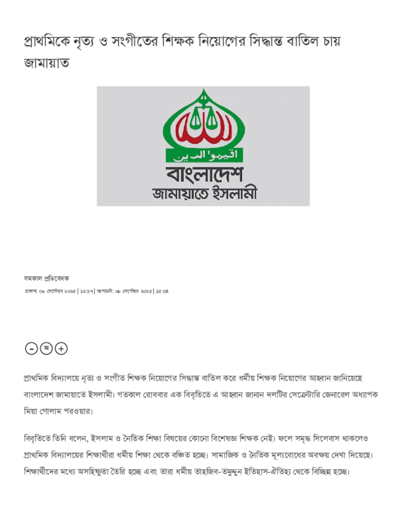 প্রাথমিকে নৃত্য ও সংগীতের শিক্ষক নিয়োগের সিদ্ধান্ত বাতিল চায় জামায়াত.pdf Published on 09 September 2025 Newspaper দৈনিক সমকাল Category Others Download