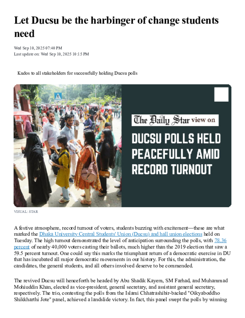 Let Ducsu be the harbinger of change students need.pdf Published on 10 September 2025 Newspaper The Daily Star Category Personal Opinion / Discussion / Commentary General Education Download