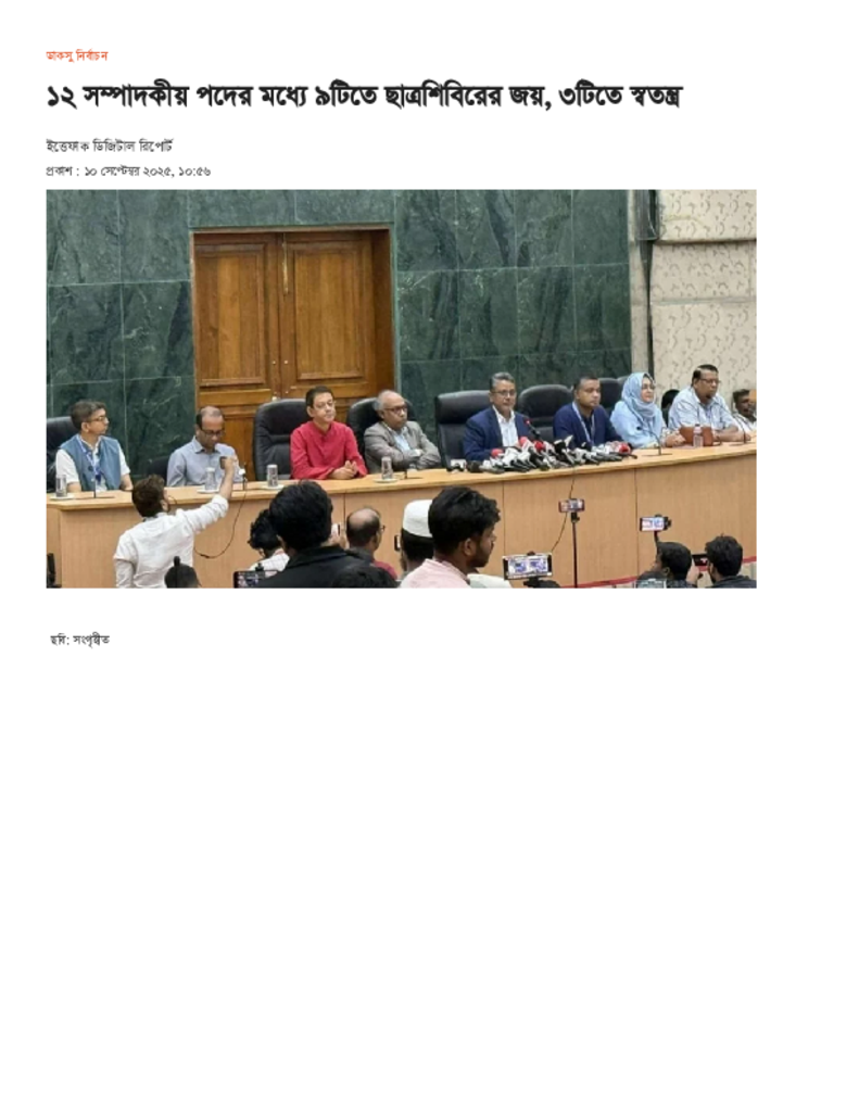 ১২ সম্পাদকীয় পদের মধ্যে ৯টিতে ছাত্রশিবিরের জয়, ৩টিতে স্বতন্ত্র.pdf Published on 10 September 2025 Newspaper দৈনিক ইত্তেফাক Category Student Politics Download