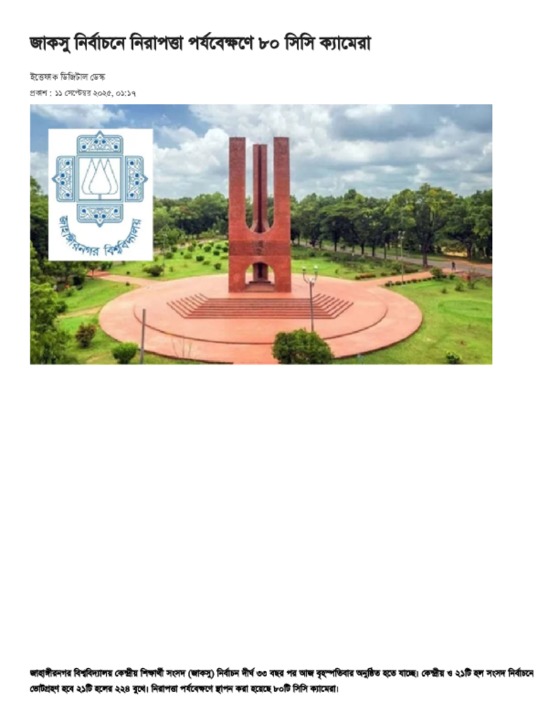 জাকসু নির্বাচনে নিরাপত্তা পর্যবেক্ষণে ৮০ সিসি ক্যামেরা.pdf Published on 11 September 2025 Newspaper দৈনিক ইত্তেফাক Category Student Politics Download
