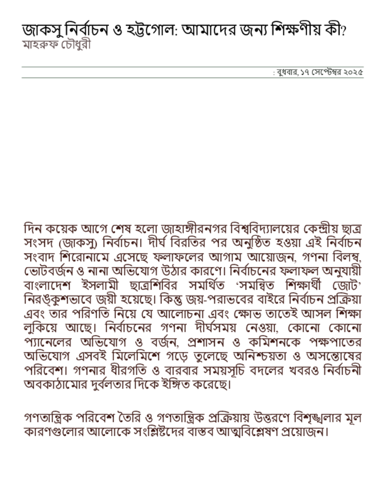জাকসু নির্বাচন ও হট্টগোল_ আমাদের জন্য শিক্ষণীয় কী_ _ সংবাদ অনলাইন.pdf Published on 17 September 2025 Newspaper দৈনিক সংবাদ Category Personal Opinion / Discussion / Commentary Download