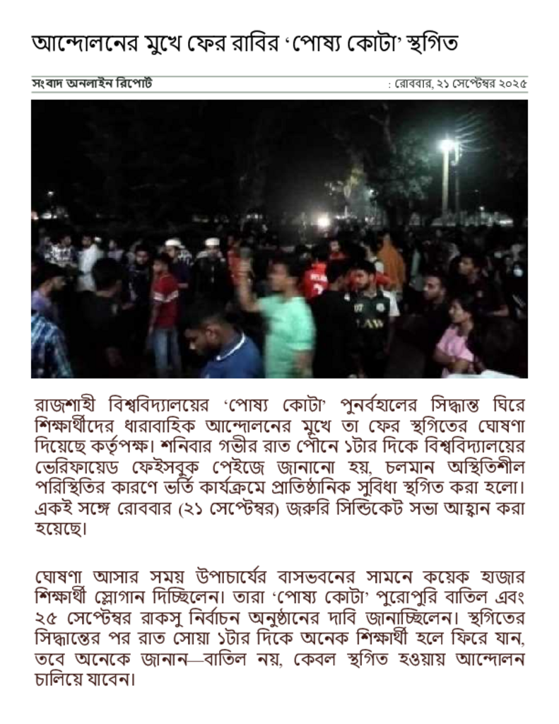 আন্দোলনের মুখে ফের রাবির ‘পোষ্য কোটা’ স্থগিত _ সংবাদ অনলাইন.pdf Published on 21 September 2025 Newspaper দৈনিক সংবাদ Category Admission / Seat Problem General Education Download