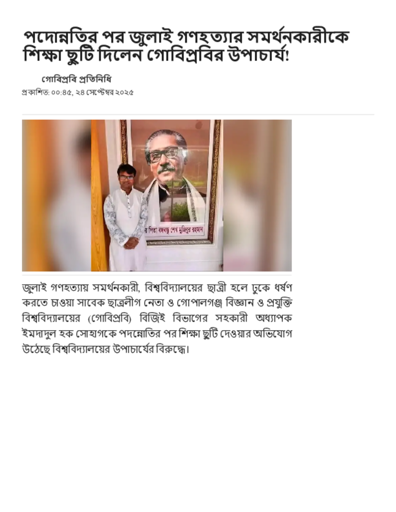 পদোন্নতির পর জুলাই গণহত্যার সমর্থনকারীকে শিক্ষা ছুটি দিলেন গোবিপ্রবির.pdf Published on 24 September 2025 Newspaper দৈনিক জনকণ্ঠ Category Personal Opinion / Discussion / Commentary Download