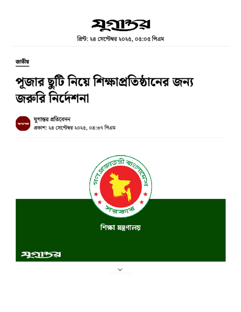 পূজার ছুটি নিয়ে শিক্ষাপ্রতিষ্ঠানের জন্য জরুরি নির্দেশনা.pdf Published on 24 September 2025 Newspaper দৈনিক যুগান্তর Category Educational Ministry / Departments Download
