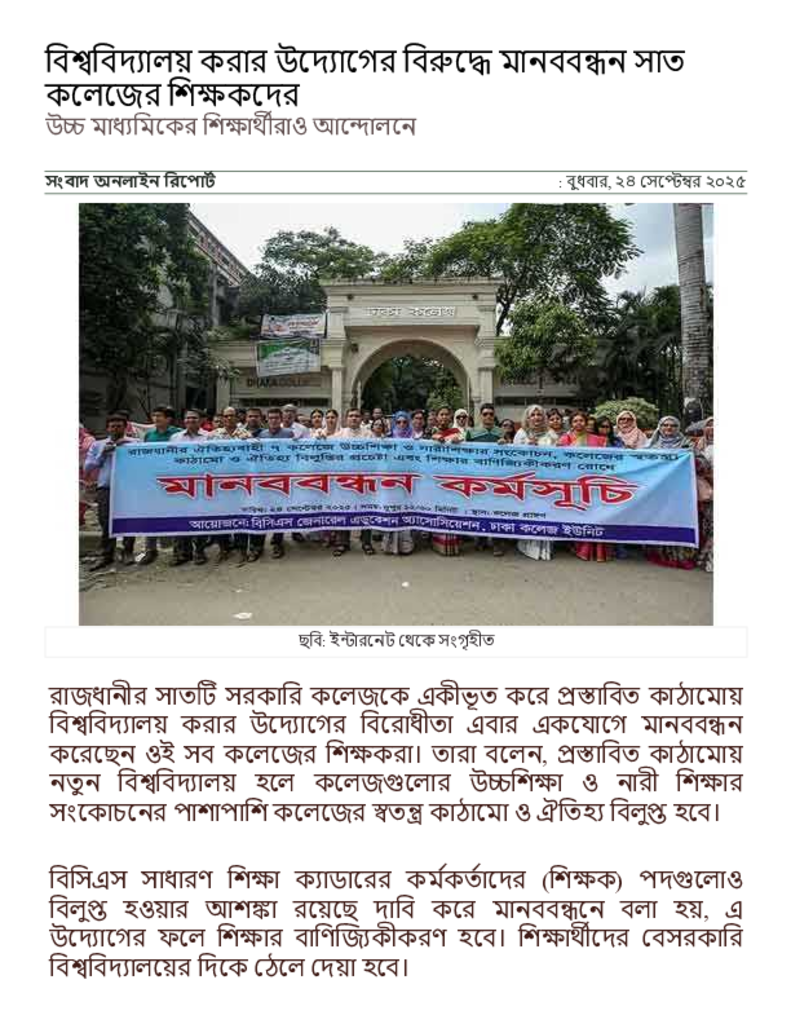 বিশ্ববিদ্যালয় করার উদ্যোগের বিরুদ্ধে মানববন্ধন সাত কলেজের শিক্ষকদের _ সংবাদ.pdf Published on 24 September 2025 Newspaper দৈনিক সংবাদ Category Personal Opinion / Discussion / Commentary General Education Download