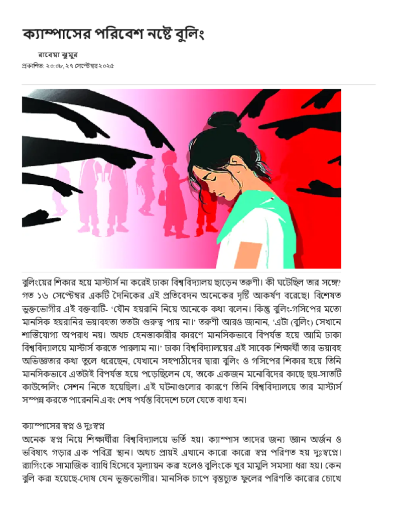 ক্যাম্পাসের পরিবেশ নষ্টে বুলিং.pdf Published on 27 September 2025 Newspaper দৈনিক জনকণ্ঠ Category Personal Opinion / Discussion / Commentary General Education Download