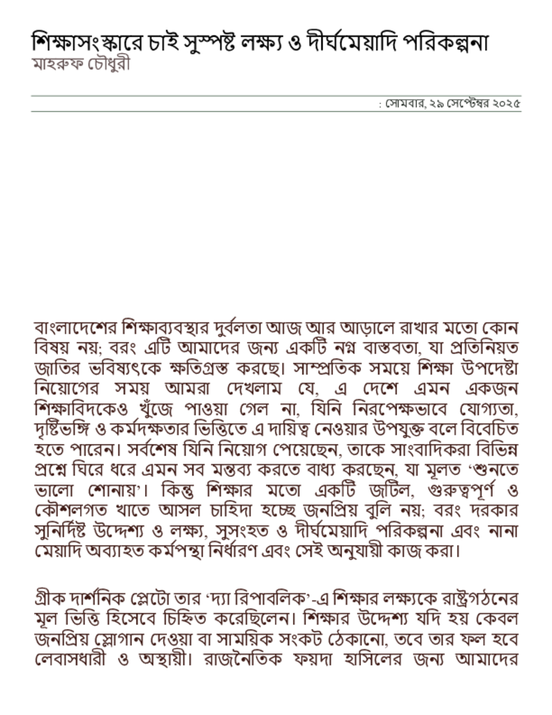 শিক্ষাসংস্কারে চাই সুস্পষ্ট লক্ষ্য ও দীর্ঘমেয়াদি পরিকল্পনা _ সংবাদ অনলাইন.pdf Published on 29 September 2025 Newspaper দৈনিক সংবাদ Category Personal Opinion / Discussion / Commentary Download