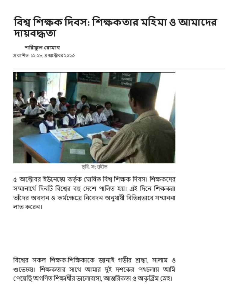 বিশ্ব শিক্ষক দিবস_ শিক্ষকতার মহিমা ও আমাদের দায়বদ্ধতা.pdf Published on 04 October 2025 Newspaper দৈনিক জনকণ্ঠ Category Personal Opinion / Discussion / Commentary Download