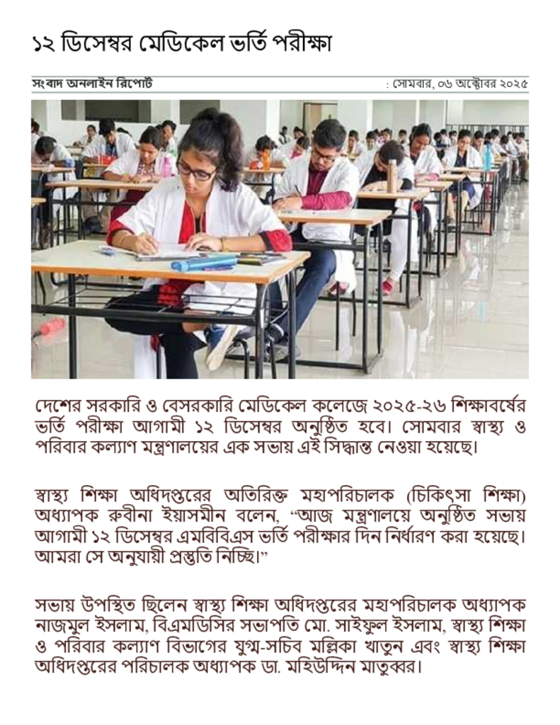 ১২ ডিসেম্বর মেডিকেল ভর্তি পরীক্ষা _ সংবাদ অনলাইন.pdf Published on 06 October 2025 Newspaper দৈনিক সংবাদ Category Admission / Seat Problem Professional Education Medical Download