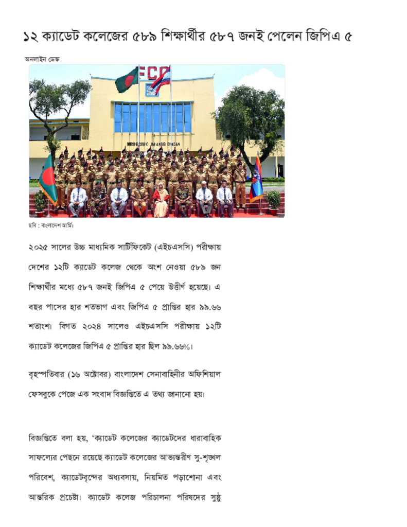 ১২ ক্যাডেট কলেজের ৫৮৯ শিক্ষার্থীর ৫৮৭ জনই পেলেন জিপিএ ৫.pdf Published on 16 October 2025 Newspaper দৈনিক কালের কন্ঠ Category Public Examination Download