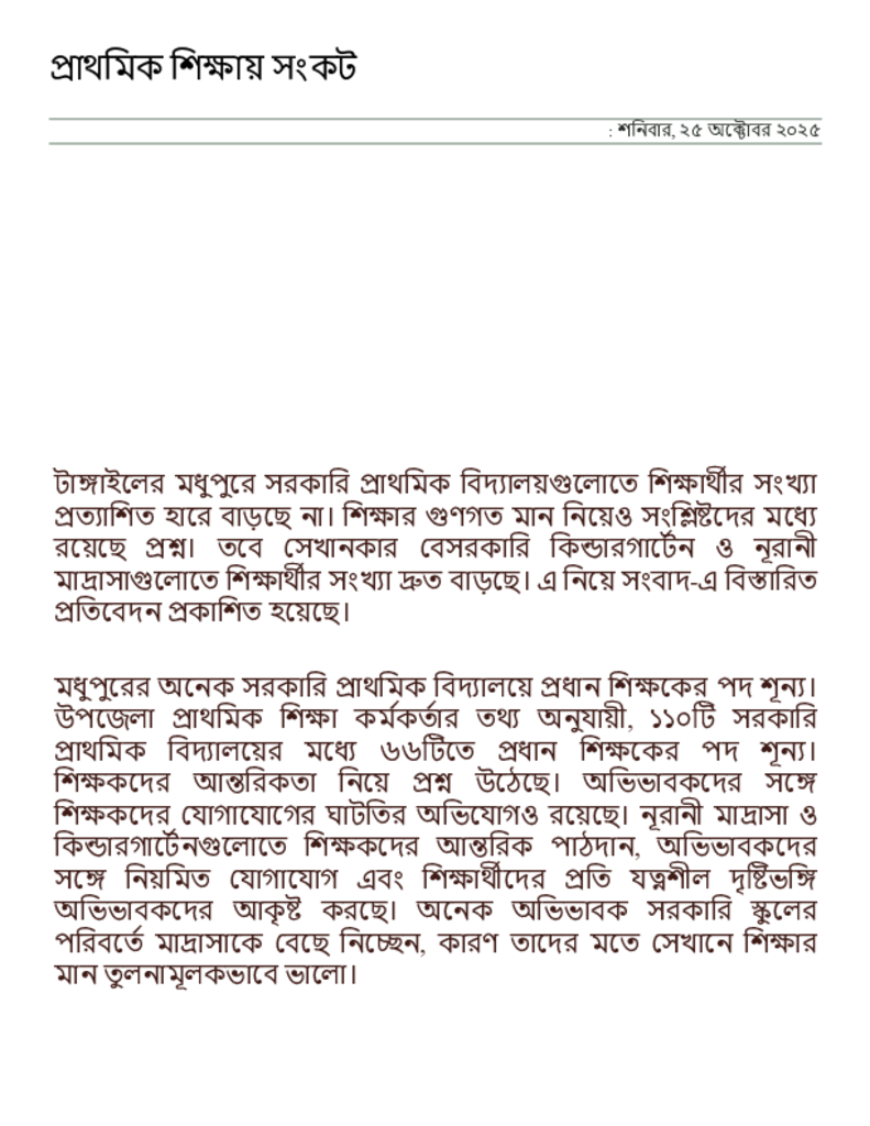 প্রাথমিক শিক্ষায় সংকট _ সংবাদ অনলাইন.pdf Published on 25 October 2025 Newspaper দৈনিক সংবাদ Category Personal Opinion / Discussion / Commentary General Education Download