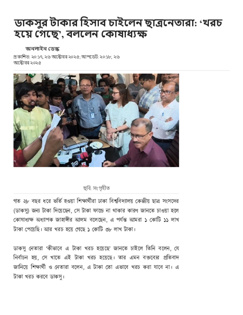 ডাকসুর টাকার হিসাব চাইলেন ছাত্রনেতারা_ ‘খরচ হয়ে গেছে’, বললেন কোষাধ্যক্ষ.pdf Published on 26 October 2025 Newspaper দৈনিক জনকণ্ঠ Category Others General Education Download