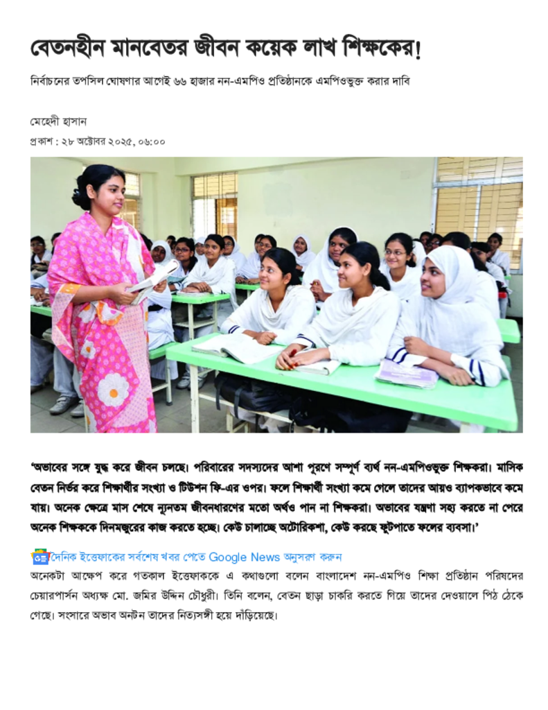বেতনহীন মানবেতর জীবন কয়েক লাখ শিক্ষকের!.pdf Published on 28 October 2025 Newspaper দৈনিক ইত্তেফাক Category Personal Opinion / Discussion / Commentary Download