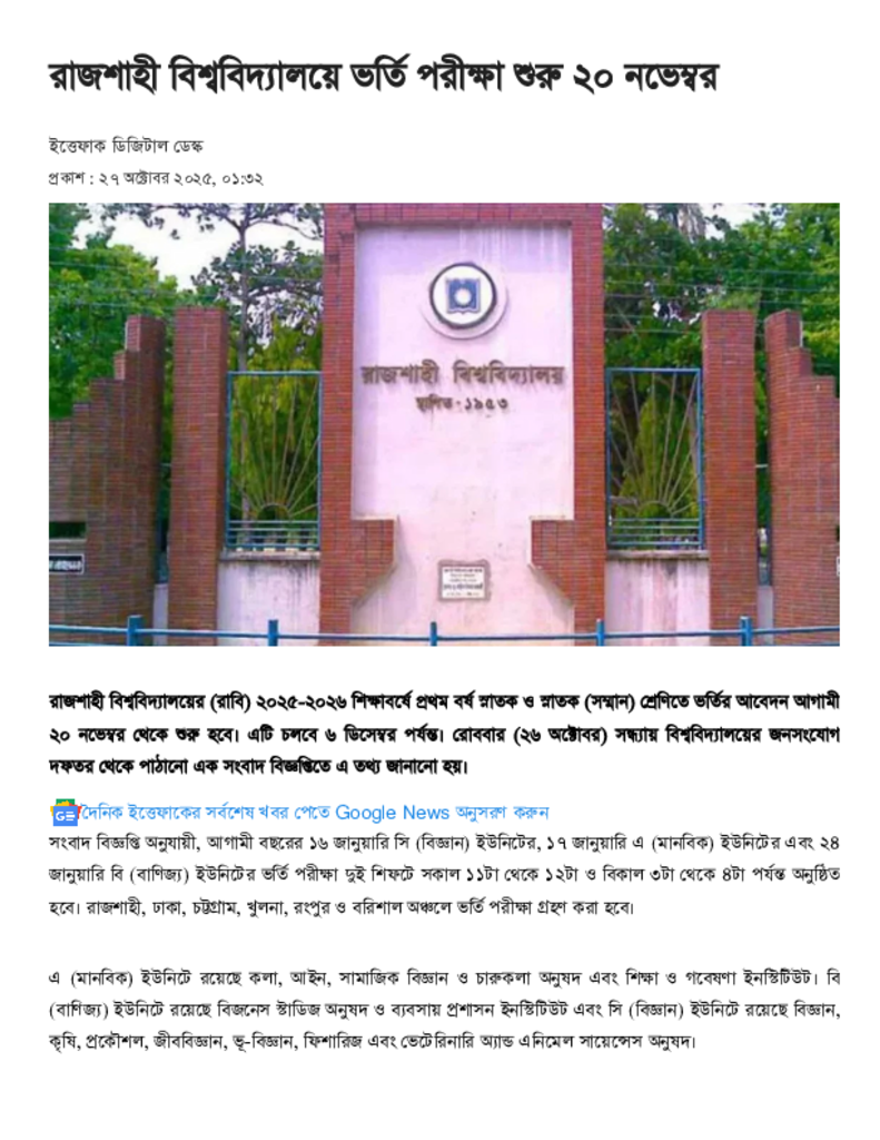 রাজশাহী বিশ্ববিদ্যালয়ে ভর্তি পরীক্ষা শুরু ২০ নভেম্বর.pdf Published on 27 October 2025 Newspaper দৈনিক ইত্তেফাক Category Admission / Seat Problem General Education Download