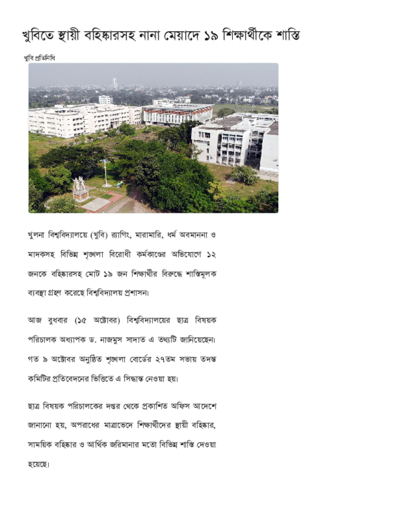 খুবিতে স্থায়ী বহিষ্কারসহ নানা মেয়াদে ১৯ শিক্ষার্থীকে শাস্তি.pdf Published on 15 October 2025 Newspaper দৈনিক কালের কন্ঠ Category Others General Education Download