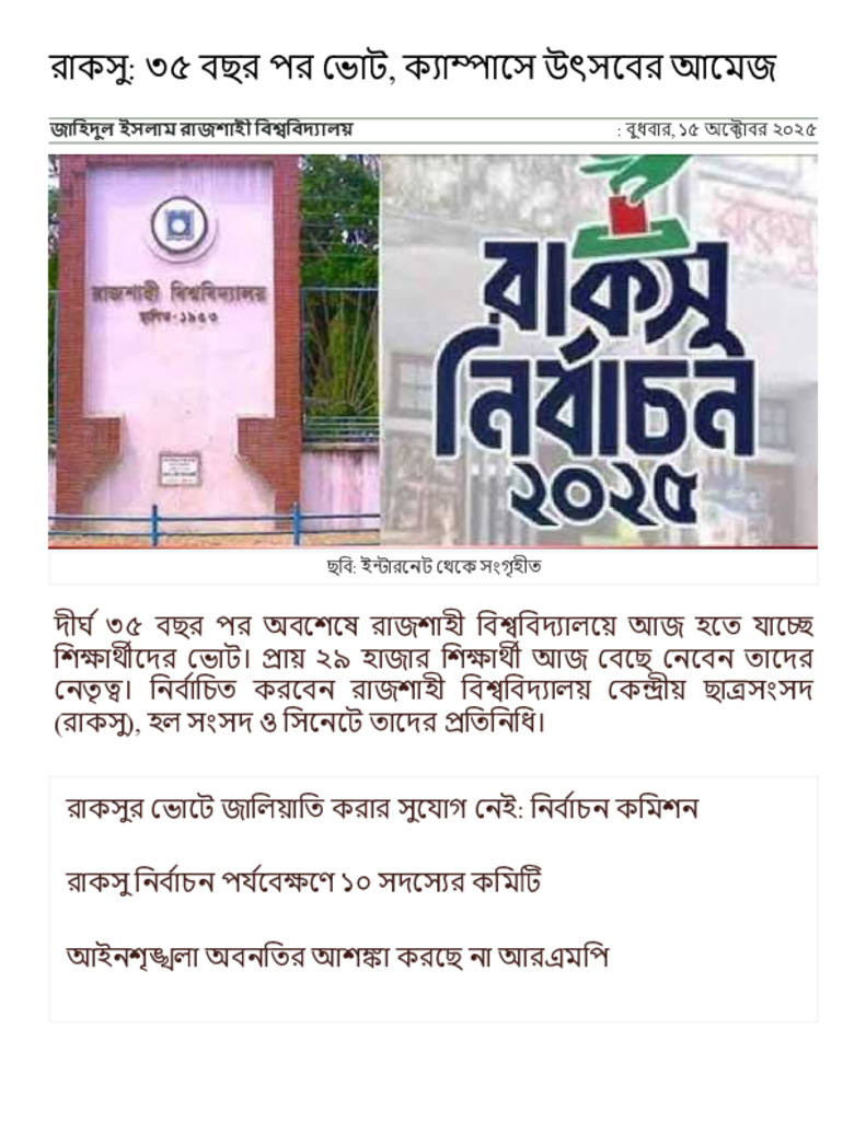 রাকসু_ ৩৫ বছর পর ভোট, ক্যাম্পাসে উৎসবের আমেজ _ সংবাদ অনলাইন.pdf Published on 15 October 2025 Newspaper দৈনিক সংবাদ Category Student Politics Download