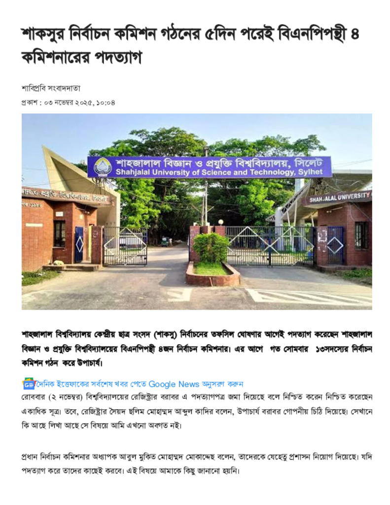 শাকসুর নির্বাচন কমিশন গঠনের ৫দিন পরেই বিএনপিপন্থী ৪ কমিশনারের পদত্যাগ.pdf Published on 03 November 2025 Newspaper দৈনিক ইত্তেফাক Category Others General Education Download