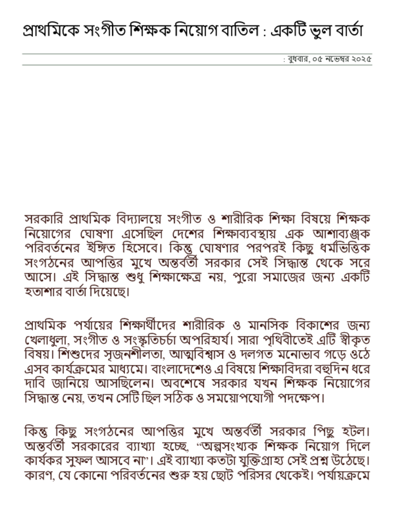 প্রাথমিকে সংগীত শিক্ষক নিয়োগ বাতিল _ একটি ভুল বার্তা _ সংবাদ অনলাইন.pdf Published on 05 November 2025 Newspaper দৈনিক সংবাদ Category Personal Opinion / Discussion / Commentary Download