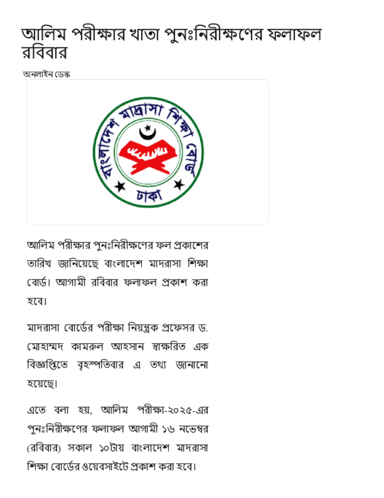 আলিম পরীক্ষার খাতা পুনঃনিরীক্ষণের ফলাফল রবিবার.pdf Published on 14 November 2025 Newspaper দৈনিক কালের কন্ঠ Category Madrasah Education Madrasah Education Alia Download
