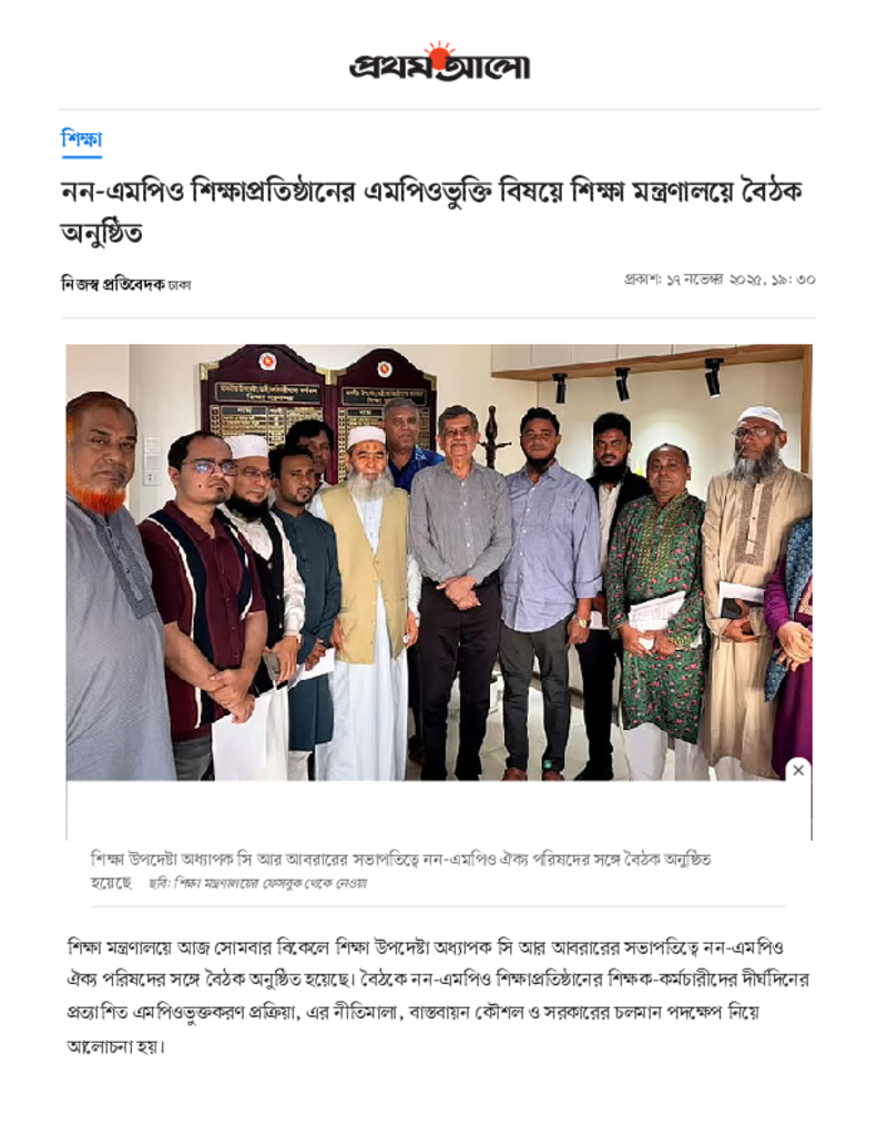 নন-এমপিও শিক্ষাপ্রতিষ্ঠানের এমপিওভুক্তি বিষয়ে শিক্ষা মন্ত্রণালয়ে বৈঠক অনুষ্ঠিত.pdf Published on 17 November 2025 Newspaper দৈনিক প্রথম আলো Category Educational Ministry / Departments Download