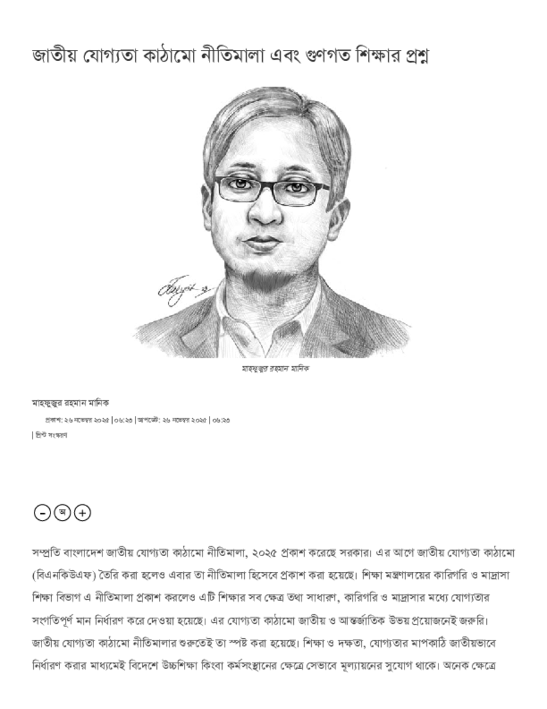 জাতীয় যোগ্যতা কাঠামো নীতিমালা এবং গুণগত শিক্ষার প্রশ্ন.pdf Published on 26 November 2025 Newspaper দৈনিক সমকাল Category Personal Opinion / Discussion / Commentary Download
