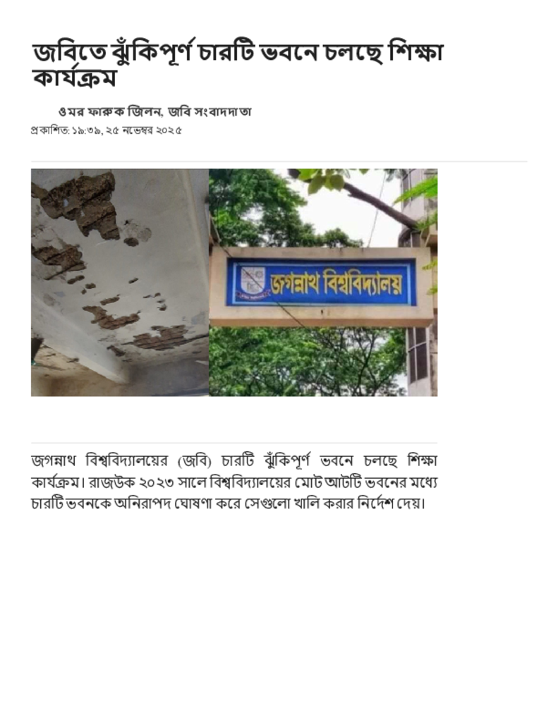 জবিতে ঝুঁকিপূর্ণ চারটি ভবনে চলছে শিক্ষা কার্যক্রম.pdf Published on 25 November 2025 Newspaper দৈনিক জনকণ্ঠ Category Personal Opinion / Discussion / Commentary Download