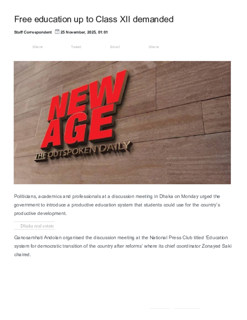 New Age _ Free education up to Class XII demanded.pdf Published on 25 November 2025 Newspaper New Age Category Personal Opinion / Discussion / Commentary General Education Download