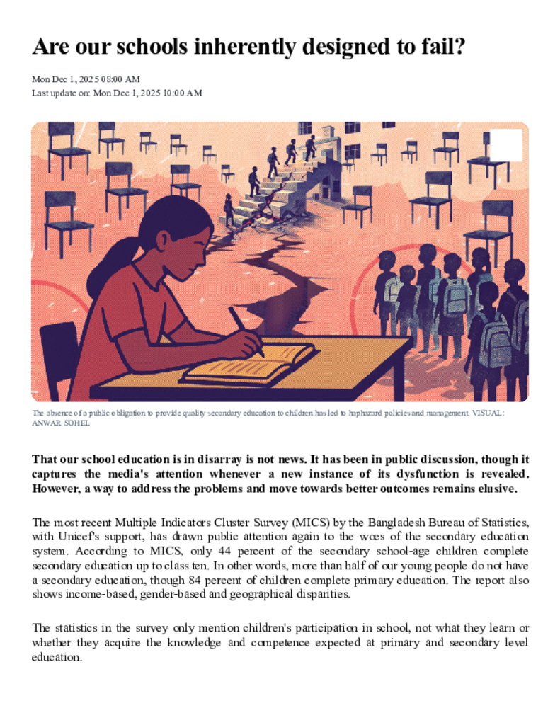 Bangladesh Secondary Education Crisis _ Are our schools inherently designed to fail_.pdf Published on 01 December 2025 Newspaper The Daily Star Category Personal Opinion / Discussion / Commentary Download