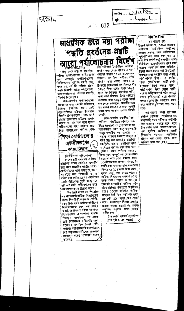 মাধ্যমিক স্তরে নয়া পরীক্ষা পদ্ধতি প্রর্বতনের প্রশ্নটি আরো পর্যালোচনার নির্দেশ Published on Newspaper দৈনিক সংবাদ Category General Education Download