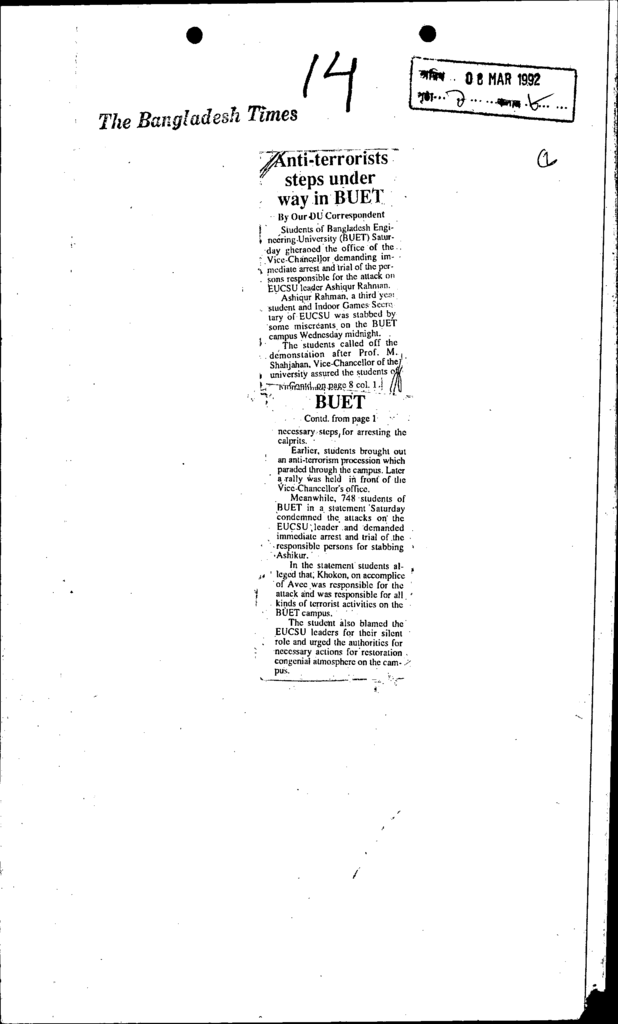 Anti-terrorists steps under way in buet Published on Newspaper The Bangladesh Times Category Professional Education Professional Education Engineering Download