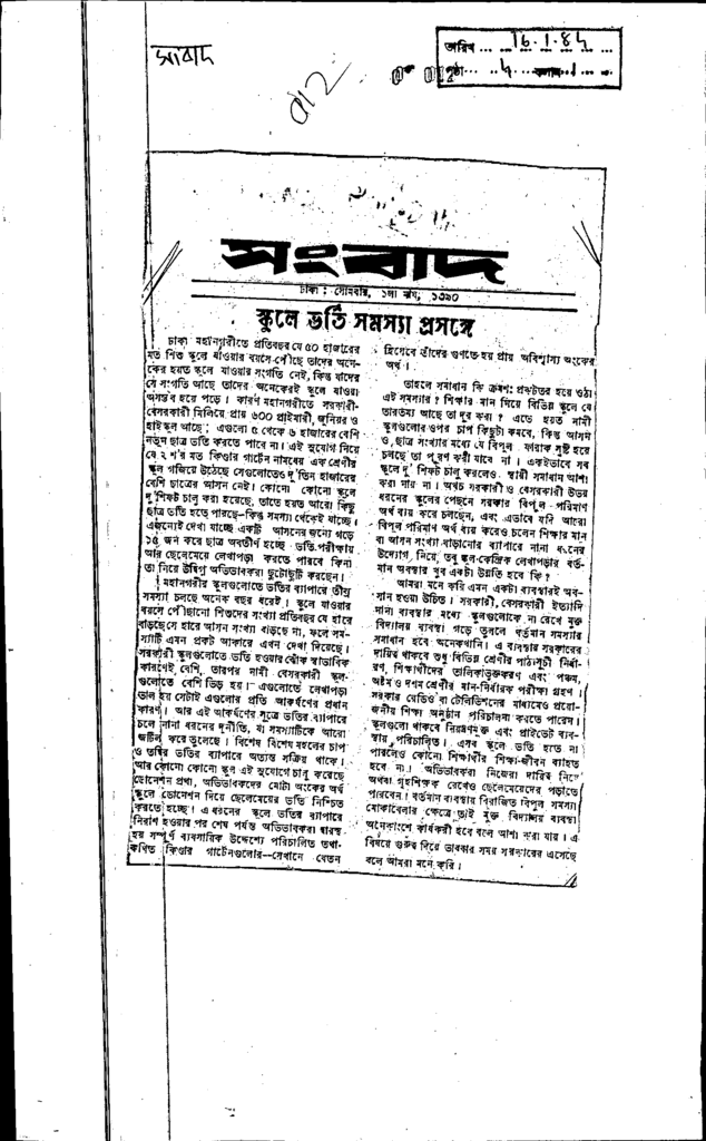 স্কুলে ভর্তি সমস্যা প্রসঙ্গে Published on Newspaper দৈনিক সংবাদ Category General Education General Education Download