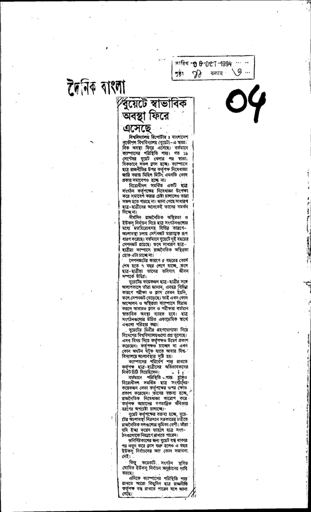 বুয়েটে স্বভাবিক অবস্থা ফিরে এসেছে Published on Newspaper দৈনিক বাংলা Category Professional Education Professional Education Engineering Download