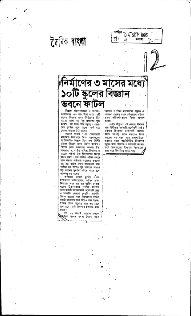 নির্মাণের ৩ মাসের মধ্যে১০টি স্কুলের বিজ্ঞান ভবনে ফাটল Published on Newspaper দৈনিক বাংলা Category Professional Education Professional Education Engineering Download
