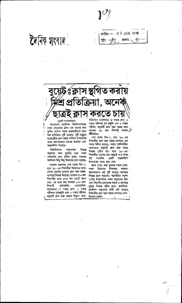 বুয়েট ক্লাস স্থগিত করায় মিশ্র প্রতিক্রিয়া অনেক ছাত্রইক্লাস করেতে চায় Published on Newspaper দৈনিক সংবাদ Category Professional Education Professional Education Engineering Download