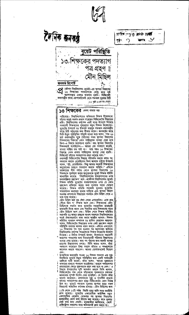 বুয়েট পরিস্থিতি ১৩ শিক্ষকের পদত্যাগ পত্র গ্রহণ মৌন মিছিল Published on Newspaper দৈনিক জনকণ্ঠ Category Professional Education Professional Education Engineering Download