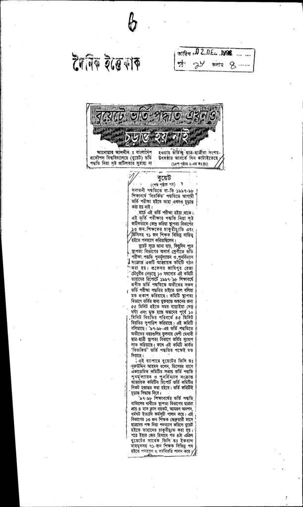 বুয়েটে ভর্তি পদ্ধতি এখনও চূড়ান্তহয় নাই Published on Newspaper দৈনিক ইত্তেফাক Category Professional Education Professional Education Engineering Download