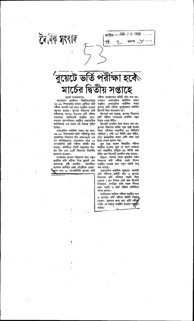 বুয়েটে ভর্তি পরীক্ষা হবে মার্চের দ্বিতীয় সপ্তাহে Published on Newspaper দৈনিক সংবাদ Category Professional Education Professional Education Engineering Download
