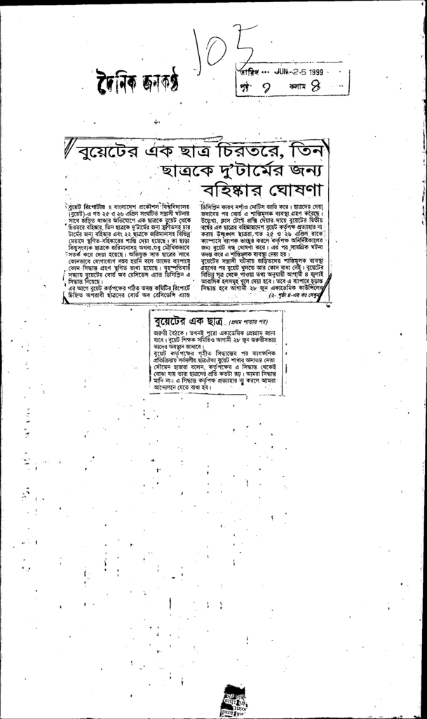 বুয়েটের এক ছাত্র চিরতরে,তিন ছাত্রকে দু’টার্মের জন্য বহিষ্কার ঘোষণা Published on Newspaper দৈনিক জনকণ্ঠ Category Professional Education Professional Education Engineering Download