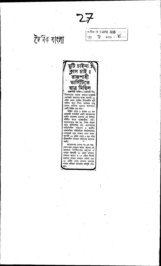 ছুটি চাইনা: ক্লাস চাই: রাজশাহী ভার্সিটিতে ছাত্র মিছিল Published on Newspaper দৈনিক বাংলা Category Education Policy / Education Commission Download