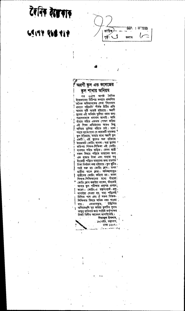অগ্রণী স্কুল এন্ড কলেজের স্কুল শাখায় অনিয়ম Published on Newspaper দৈনিক ইত্তেফাক Category Personal Opinion / Discussion / Commentary Personal Speech / Discussion / Comentary Secondary and Higher Secondary Education Download